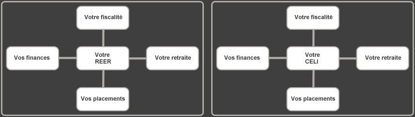 Le régime enregistré d’épargne retraite REER et le compte épargne libre d’impôt CELI touchent à plusieurs facettes de votre planification financière personnelle. Voyons les différents domaines qu’ils touchent à l’aide du schéma qui suit :