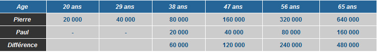 Le constat, Pierre aura déposé au total 36 000 $, quand à Paul, ses dépôts s’élèveront à 238 923 $* soit 6,6 fois plus que Pierre.